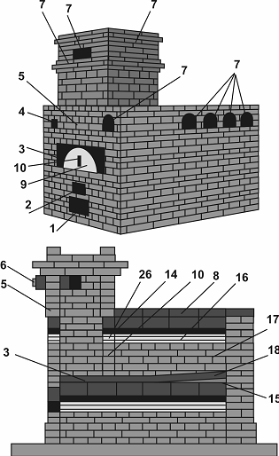 1 – подпечье; 2 – ниша; 3 – шесток; 4 – душник; 5 – щиток; 6 – задвижки; 7 – труба; 8 – перекрыша; 9 – заслонка; 10 – устье; 11 – разделка трубы; 12, 13 – печурки; 14 – порожек; 15 – засыпка; 16 – свод; 17 – топливник; 18 – под