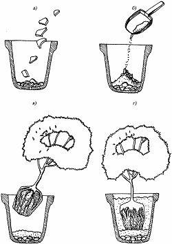 Пятый метод. Вы едете за город и ищете там маленькие деревья, выдержавшие все бури. Если найти такое дерево, откопать и, придав форму, пересадить, то это уже будет хорошая основа для бонсай. Возможно, корни деревца окажутся недостаточно развитыми. В этом случае полезно пересадить его в землю на год или более, чтобы у растения развилось как можно больше поверхностных корней, при этом продолжая работать над его формой. После этого деревце следует выкопать и поместить в контейнер уже в качестве бонсай.