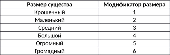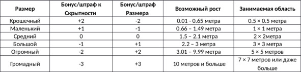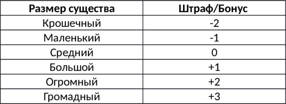 Бонусы и штрафы размера: размер, отличный от Среднего, может быть выгоден в одних ситуациях, и сильно мешать в других. Небольшому существу легче прятаться и уворачиваться от ударов, а крупному – хватать и удерживать противника.