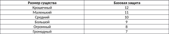 Базовая защита (БАЗщ) – отражает защиту неподвижного существа. Высокая БАЗщ обычно указывает на небольшой размер существа или на иные факторы, затрудняющие попадание, но не связанные с подвижностью или защитным снаряжением. БАЗщ = |10 ± БШР|