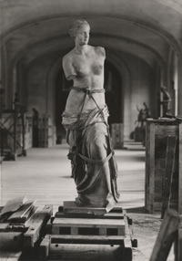 Я сел читать и сразу же окунулся в нелёгкий музейный быт сороковых годов прошлого века. Мне до этого было известно, что со времён Первой мировой войны у Лувра был хорошо продуманный план эвакуации экспонатов. Он и был приведён в действие в конце тридцатых годов. На редкой фотографии величественная Большая галерея, где обычно стены – живой учебник истории искусства, пуста, замусорена. На другой Венера Милосская, стоящая на деревянном подиуме. Кругом ящики, тележки, кособокая лестница. Богиня обмотана какими-то верёвками, будто перед повешеньем. Из-за этих перевивов создаётся впечатление, будто ей за спиной повязали руки. Из всех возможных положений верхних конечностей непокалеченной скульптуры (а таких предположений великое множество) это самое необычное. Вид у Венеры растерянный: «Меня снова везут? Куда? Как бы теперь ноги не отломили».