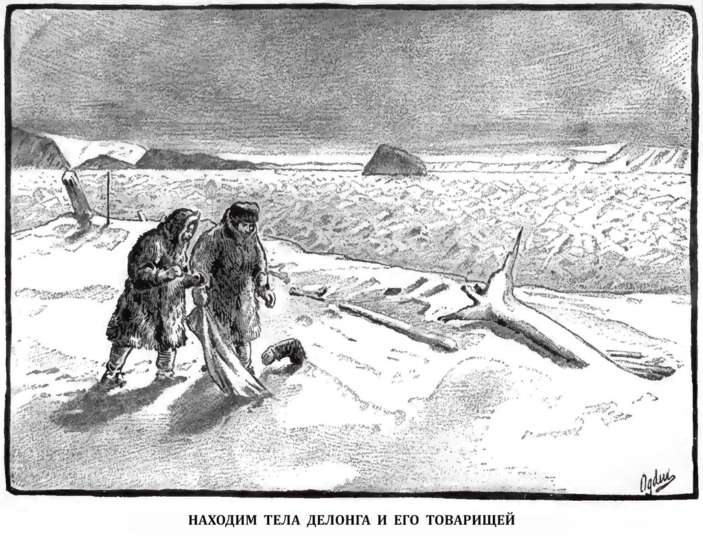 Два других предмета оказались телами доктора Эмблера и Ах Сэма, повара-китайца. Вокруг валялось несколько мелких предметов, которые я собрал и положил в чайник. Помимо дневника я также нашёл аптечку и жестяной цилиндр диаметром три дюйма и длиной почти четыре фута, в котором находились чертежи и карты экспедиции. Отправив Иннокентия за Ниндеманном и, пока он не прибыл, я занялся тем, что стал читать записи в дневнике, начиная с последней. Я узнал, что после Эриксена следующим умершим была Алексей, и что он похоронен во льду реки возле плоскодонки. Из этого я понял, что весь отряд должен находиться где-то здесь, в пределах пятистах ярдов. Отойдя от лодки ещё примерно на триста ярдов, они были остановлены сильным южным ветром и поэтому разбили лагерь там, где мы нашли знак из палок с винтовкой, и там все, кроме этих троих, погибли. В дневнике рассказывалось о том, как оставшиеся люди были настолько слабы от голода, что не могли похоронить Ли и Каака – следующих двух, которые умерли после Алексея, – во льду реки, поэтому «отнесли их за угол с глаз долой». «Затем, – пишет Делонг, – у меня закрылись глаза». (Ниндеманн говорил мне, что у капитана сильно заболели глаза, и когда они расставались, он был почти слеп, что объясняет эту запись в дневнике.)