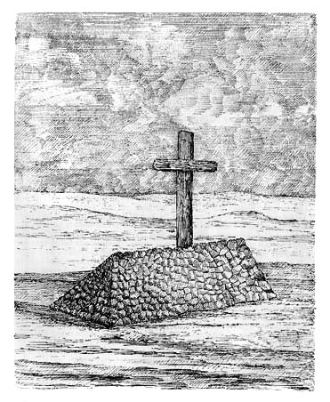 Место погребения представляет собой отвесный мыс, обращённый к Ледовитому океану. Скалистая вершина горы, холодная и суровая, как Сфинкс, хмуро смотрит на место, где погиб отряд; истерзанная ветрами и утомлённая веками, казалось, она готова навечно приютить этих смельчаков. Я достиг вершины мыса, объехав с юга его величественный неприступный фасад, а затем медленно взошёл на самую вершину. Здесь я нашёл место для могилы моих товарищей и отметил его крестом, сориентировав его по компасу в направлении север-юг. Вершина горы полностью очищена от снега свирепыми ветрами, которые постоянно дуют на этой высота, а массивный каменный купол покрыт трещинами. Это вода в тёплое время года затекает к трещинки горных пород, а зимой мороз, этот многомудрый горный инженер, приводит в действие свои хитрые законы, разрывая сплошное каменное ложе на множество осколков, так что его поверхность, хотя и ровная, как стол, расколота на глубину нескольких футов наподобие кирпичной кладки. С большим трудом я вытащил несколько камней из центра размеченного мною креста и расширил яму до глубины трёх футов и диаметра два фута.