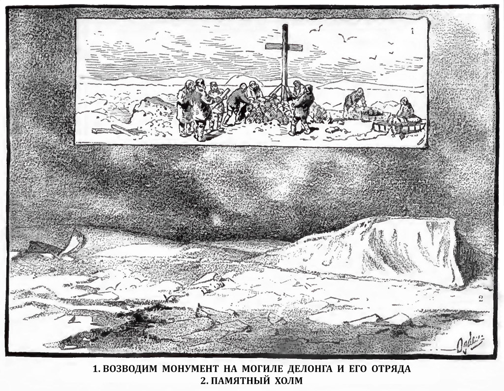 Остальные тем временем занимались доставкой частей гроба и креста на вершину горы. Я прибыл туда, когда дул сильный ветер, и обнаружил, что водрузить крест на место оказалось более трудным делом, чем я себе представлял. Работать без рукавиц на морозном воздухе было невозможно; у нас не было никаких снастей, кроме тех, что я смастерил из собачьей упряжи, и жерди с развилкой на конце для поддержки при подъёме. Из нас только трое говорили по-английски – Грёнбек, Бартлетт и я, – и туземцы не могли понять моих команд и что им делать; при этом они, кажется, не вполне осознавали большого веса креста, пока при первой попытке поднять его не увидели, как он неудержимо рыскает из стороны в сторону – и тогда они все в панике разбежались. Но, наконец, постепенно, после многих опасных ситуаций крест был поднят, и, повернув его к востоку, я скорее закрепил его на месте четырьмя большими камнями. Затем, убедившись в его совершенно вертикальном положении, я заполнил его основание мелкими камнями и вылил на них ведро ледяной воды, которая вскоре замёрзла и скрепила их вместе. Гроб был плотно сбит, а к закрытию его сверху подготовлены круглые жерди, затем мы покрыли дно хворостом и какими-то старыми тряпками, и положили на них наших бедных товарищей, расположив в порядке их имён, как написано на кресте, с капитаном Делонгом на южном и Ах Сэмом на северном конце гроба. Все они были положены головами на запад, а лица, по возможности, были обращены на восток и восходящее солнце. На телах мы не оставили ничего, кроме большого бронзового распятия на груди мистера Коллинза. Когда Бартлетт и Ниндеманн нашли на нём крест и спросили, следует ли им забрать его, я сначала был склонен ответить утвердительно, думая, что его родственники, несомненно, захотят сохранить столь памятную вещь; но, немного поразмыслив, решил, что, как предмет его религиозных убеждений пусть это будет похоронено вместе с ним.
