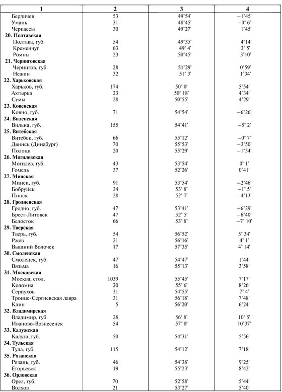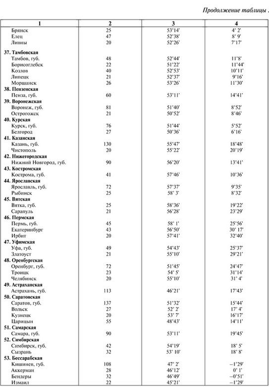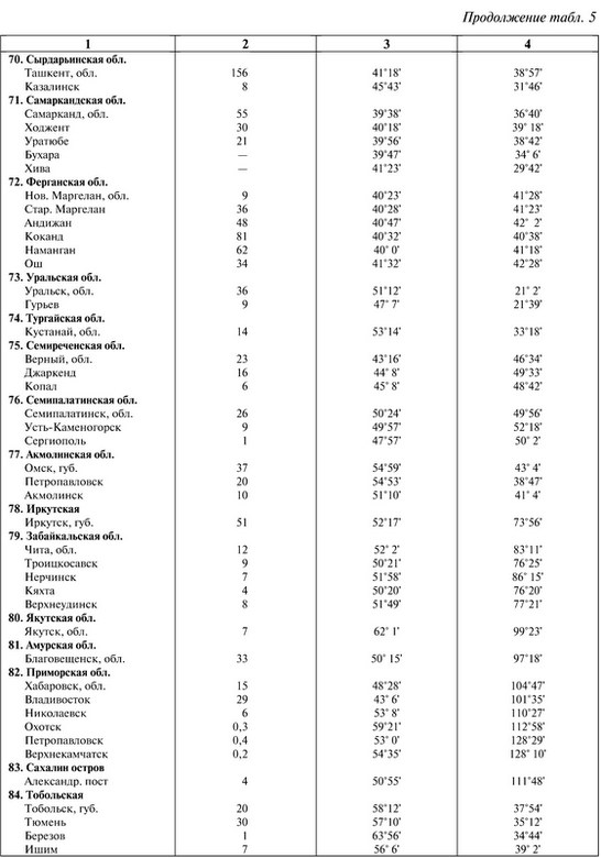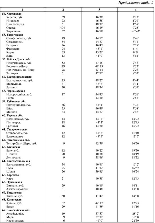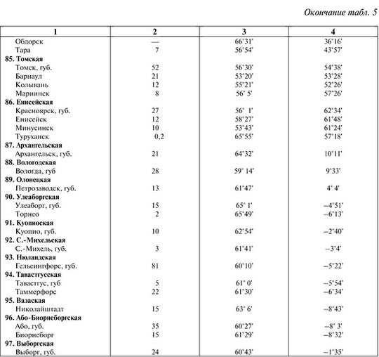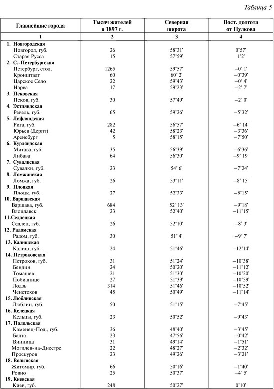 Так как немалого труда стоило разыскание наиболее точных определений положения главнейших городов, то я считал не излишним привести здесь их список, с указанием широт и долгот (табл. 5), отвечающих им, ограничиваясь при этом минутами дуг как по меридианам, так и по параллелям, потому что большая точность в географическом смысле совершенно излишня и может относиться только к определенным геодезическим знакам.