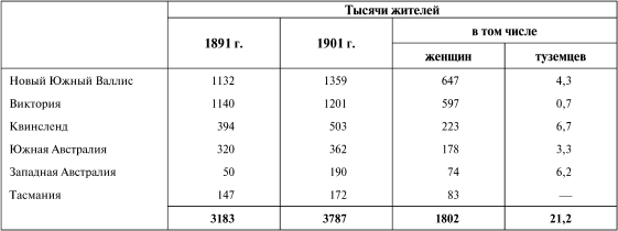 Новый Южный Валлис, Виктория, Квинсленд, Южная Австралия, Западная Австралия и Тасмания образуют ту совокупность самостоятельных штатов (Original States) Австралии, которая собранием 1 января 1901 г. названа «The Commonwealt of Australia» – «Соединенною Австралией». Для нее вообще D = 7700 тыс. кв. км. Данные для населения приводим по отдельным штатам для двух последних переписей: