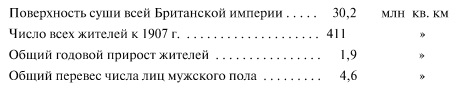 Слагая данные для всех перечисленных американских владений Англии, получаем: D = 9844 тыс. кв. км и А = 7,50 млн. По числу жителей Канада с Ньюфаундлендом преобладают, содержа (5526 + 233 тыс.) более 75 % населения, а потому, зная, что для Канады и Ньюфаундленда (в сумме) В = 60 тыс. и С = –141 тыс., можно с большою вероятностью признать для всей суммы английских земель в Америке: В = 15 тыс., или 1 %, и С = –106 тыс., что и внесено в табл. 1. Из величин D и А видно, что на жителя здесь приходится более 100 кв. км, а именно по 131 гектару. Это почти такой же простор, как у нас в Западной Сибири. Еще больше свободных земель у Англии в ее австралийских владениях.