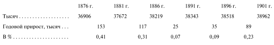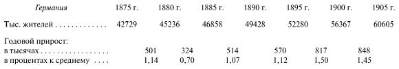 В Англии годовой прирост за последнюю четверть столетия изменился от 0,78 до 0,97 % и наименьший прирост приходится на конец 80-х годов; во Франции за это время прирост изменился от 0,07 до 0,23 % и наименьший прирост опять близок к концу 80-х годов XIX ст.; здесь за это время прирост был гораздо бо́льшим: изменился от 0,7 до 1,5 %, но наименьший прирост опять падает, по-видимости, на тот же срок, как видно уже из того, что во всех трех странах с 1890 г. по 1900 г. процент прироста явно возрастает.24 Важнее же всего указать на то, что процент прироста в Германии много выше, чем в Англии, – не говоря о Франции, – что определяется исключительно большим процентом рождаемости: