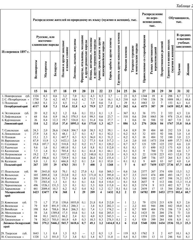 Распределению жителей России по природному языку во всех отношениях соответствует распределение по религиозным верованиям. В этом отношении в таблицах отмечены лишь три категории жителей. В столбце 27 дано число православных, равное 89 1/4 млн, т. е. как раз почти столько, сколько имеется великороссов, малороссов и белорусов с небольшой прибавкой финских народов, принявших православие. В столбце 28 даны жители, держащиеся других христианских исповеданий. Их всего числом около 19 млн. И почти столько же имеется у нас нехристиан, между которыми главное место занимают евреи (около 5 млн) и турецко-татарские народы (около 14 млн). Что касается христиан разных исповеданий, то между ними преобладают католики Польского и Литовско-Белорусского краев и лютеране Финского и Ливонского краев, а затем, конечно, большинство романских и германских народов.