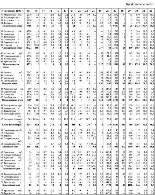 В конце табл. 2 (столбцы 30–32) даются численные сведения о распределении жителей по степени школьного их образования, а именно в столбце 30 указано число тысяч жителей, получивших первую степень обучения в низших школах или обучившихся, по крайней мере, чтению и письму. В столбцах же 31 и 32 указано количество тысяч лиц, получивших среднее и высшее образование, и при этом различены мужчины (столбец 31) от женщин (столбец 32). Соединяя вместе число лиц с высшим и средним образованием (хотя те и другие различены в переписи), я имел в виду то общее современное положение вещей, касающихся просвещения, которое мне, посвятившему лучшие 35 лет своей жизни делу образования, довольно близко известно. Если бы эту таблицу пришлось составлять лет 15 тому назад, я бы непременно отличил лиц, получивших среднее образование, от лиц, получивших высшее, т. е. специализированное образование, основанное в большей или меньшей мере на философских началах. Но в последнее время – не потому, что поднялся уровень среднего образования, а потому, что упал уровень высшего образования, – я не считаю полезным отделять два указанных разряда лиц, получивших права на звание интеллигентов. Думаю даже, да и знаю на опыте, что немалое число лиц, не учившихся в средних и высших учебных заведениях, в рядах интеллигенции в России в настоящее время занимают такое же место, какое принадлежит выступающей образованности. Уже одно то, что стачки и забастовки последнего времени повели свое начало во многих местностях России именно от высших и средних учебных заведений, говорит для меня совершенно ясно, что образование в России за последние годы сильно упало, что доказывается еще лучше тем малым научным содержанием, которое находится в литературных, технических и всяких иных прогрессивных произведениях последнего времени. Конечно, не только живет еще остаток от прежнего времени расцвета русского образования, но есть и между новыми учащими и учащимися некоторый процент таких, которые понимают, что дело политики ни под каким видом нельзя смешивать с делом обучения. Они, однако, напрасно старались протестовать: большинство недоучек этого протеста не поняло и назвало их «черною сотнею», очевидно, благодаря тому, что внушено всем образованием, ведущимся со времен покойного графа Д. А. Толстого, т. е. с 70-х годов, на так называемый «классический» манер, по существу подражательный, диалектический, даже синтаксически-логический и справляющийся с субъективно-людской, а не Божеской или объективной правдой19, которую будто бы можно постигать лишь при помощи одних умственных построений. Мне бы хотелось, но на это не может быть никаких численных данных, отобрать истинно просвещенных людей, способных самостоятельно и благодушно обсуждать действительность по изучению и по разуму, и я желал бы показать их сравнительно малое количество по отношению ко всему населению, судящему по внушению и предрассудкам. За неимением этой возможности принужден остановиться на трех вышеуказанных столбцах.