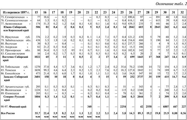 В двух последних столбцах (25 и 26) перечисляется количество (тысяч) жителей, принадлежащих к урало-алтайской и финно– (угро-) татарской группе, которая во всем свете очень велика, но по своему делению представляет наибольшие трудности и условности. Чаще всего эту группу языков делят на три семьи: финскую, монгольскую и турецко-татарскую. Но так как главные представители монгольской расы, а именно: китайцы, японцы и настоящие монголы – у нас очень малочисленны, а имеются из этой группы только астраханские калмыки, камчадалы, коряки, алеуты, тунгусы, айны и тому подобные мелкие народы, то в нашей таблице монгольско-тунгусские народы соединены с татарскими и от этих последних отличены лишь финны, к которым принадлежат не только угорские финны соответственного края, но и рассеянные более или менее в разных других краях России карелы, эстонцы, лопари, черемисы, зыряне, мордовцы, вотяки, пермяки, остяки и т. п.