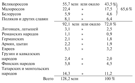 Из сказанного видно, что в крупных чертах абсолютное и процентное распределение народов, образующих Россию, есть следующее: