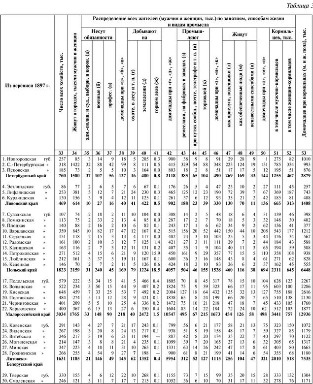 В столбце 43 содержится счет 5,1 млн лиц, зарабатывающих на промышленности переделывающей, т. е. ремесленной и фабричнозаводской. В переписи в этом отношении сделано очень много различий: выплавка металлов, обработка волокнистых веществ, животных продуктов, дерева, металлов, изделий из глины и стекла, химических продуктов, разных напитков, табака, производство печатных изделий, разных инструментов (физических, оптических и т. п.), ювелирных изделий, одежды, стройки, экипажей и т. п., но, не желая усложнять своих таблиц, я все отдельные числа свел в один столбец 43, тем более что и при таком скоплении разнообразных отраслей производства и ремесел получилась сравнительно небольшая общая сумма. Она пропорционально велика только в Подмосковном промышленном районе, где более 9,6 % жителей работают в указанном направлении. Сравнительно крупна и в Петербургском, Пермском и Польском краях, но во всех остальных промышленников относительно очень мало, что и отвечает общему слабому развитию у нас переделывающей промышленности.