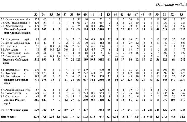 В столбце 42 содержится наибольшая цифра жителей, а именно на всю Россию 76,7 млн жителей, составляющих домочадцев лиц, занятых добывающими видами промышленности трех предшествующих столбцов. В них менее 15 % жителей, а их семей около 60 % от всего населения России, т. е. на каждого добывателя приходится около 4 домочадцев (точнее, 4,08 %); иными словами, добыватели – кормильцы по преимуществу. Это относится, конечно, к земледельцам в наибольшей мере, как видно уже из того, что земледельческие края имеют сравнительно наибольшее количество детей до 10-летнего возраста; но это же отношение показывает и необходимость идти в мировой эволюции вперед, потому что сами по себе земледельцы, как, надеюсь, доказано выше, никогда богатства нашей стране не доставят, в какую бы сторону ни пошло развитие земледелия, если рядом не будет развитой промышленности, доставляющей первых и естественнейших потребителей для произведений земли и заработки прибывающим поколениям.