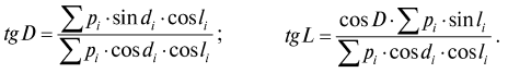 Когда центры поверхности и населенности всех губерний были найдены, тогда для отыскания общего центра всей империи должно было рассуждать, как в механике рассуждают при нахождении центра тяжести суммы точек, связанных между собой невесомыми связями, например как планеты в Солнечной системе. Не вхожу здесь в способы вывода, сделанного моим сыном И. Д. Менделеевым, студентом математического факультета С.-Петербургского университета, когда я с самого начала ему поручил весь этот расчет, занимаясь сам в то время (декабрь 1905 г.) подробностями, касающимися способов, считаемых мною полезными для снабжения России надлежащими наставниками низших, средних и высших учебных заведений. Прямо привожу только результат, в виде тригонометрических равенств, в которых: 1) через li и di означены широты и долготы каждой точки, вес которой (в данном случае поверхность или число жителей губернии) означен буквою pi; 2) знак Σ означает сумму величин, написанных после этого знака, и 3) L и D означают искомые широту и долготу центра тяжести общей суммы всех взятых точек: