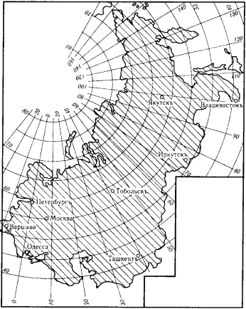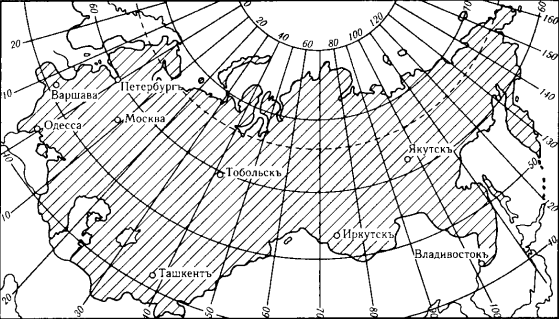 Изображение всей России на географических картах, однако, чрезвычайно мало удобно именно по той причине, что она вытянулась с запада на восток от Пулковского меридиана – 12 3/4° на западной границе, в Польше, – до 159 1/2° на востоке, у Берингова пролива.