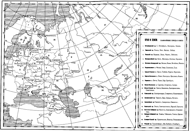 Поэтому я употребил немало усилий и попыток на то, чтобы найти такой способ картографического изображения всей России, в котором Европа сливалась бы с Азией и выступало бы ныне первенствующее значение Европейской России. После множества разнообразных проб, которые не стоит описывать (или потому, что они очень извращали все очертания страны, или потому, что представляли большие трудности в выполнении), я остановился на том способе, который применен на карте, прилагаемой к этой брошюре, и здесь (с. 99) представлен в эскизном виде.