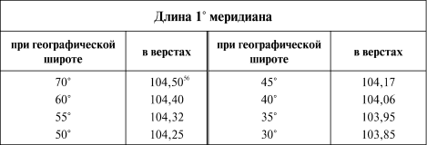 Окружность земного меридиана равна 40008 км, или 37502,8 версты, что и дает среднюю длину 1° меридиана 104,17 версты (=111,13 км), какая получается при широте 45°. К экватору идет уменьшение, к полюсам увеличение длины 1° меридиана.
