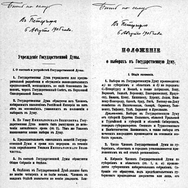 Манифест 6 августа, устанавливающий новую и прямую связь монарха с народом, и сопровождающие его разъяснения дают выборным членам Государственной думы право законодательных начинаний. Статья 34-я закона об учреждении Думы прямо говорит: «Государственной думе предоставляется возбуждать предположения об отмене или изменении действующих и издании новых законов».