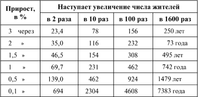 Для ясности присовокупляю небольшую таблицу, показывающую число лет, когда наступает удвоение, возрастание в 10 раз, в 100 и в 1600 раз числа жителей при разных величинах прироста.