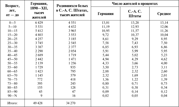По 11-й переписи, всех жителей в 1890 г. было 62,6 млн, но в их числе природных белых жителей от матерей и отцов, в Штатах родившихся, было только 34,3 млн, и вот они-то сочтены в нашем дальнейшем расчете (исключая лишь 47 тыс. жителей неизвестного возраста). В прилагаемой табл. 1 для Германии и Штатов приведены не только абсолютные числа в тысячах жителей каждого возраста, но и процентные количества лиц каждого возраста, чтобы дать легкую возможность сделать сличение. Ввиду сходства процентных чисел в последнем столбце дан средний процент возрастного состава.