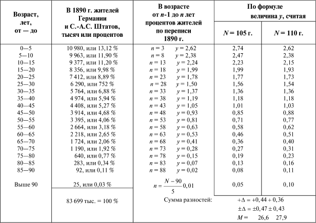 Это определяется, по всей вероятности, не столько успехом медицины и гигиены, сколько развитием благосостояния и уменьшением шансов погибнуть в зрелом возрасте, не доживая до старости; получаемые для разных значений n величины предельного возраста N, очевидно, не могут быть тождественны между собою и тем ближе к истине или вероятнейшему, чем более величина у. На основании этого и рассчитана средняя величина N, и она оказалась лежащею вблизи от N= 105 до N = 110 лет для той совокупности данных, которые взяты из приведенных выше переписей Германии и Соединенных Штатов. Подставляя эти числа, получаем