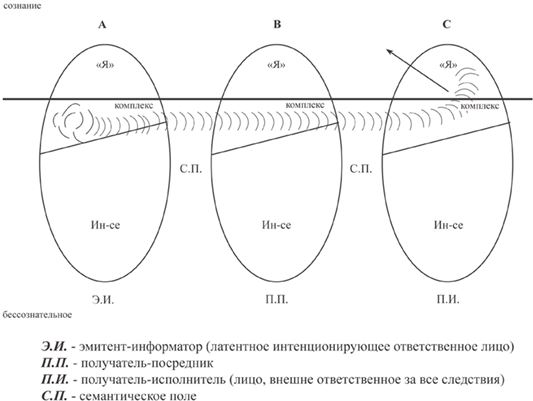 На рисунке представлены три субъекта: А, В и С. Предположим, что эти три человека каким-то образом знают друг друга: это могут быть три друга, семья или три случайных знакомых. Может произойти так, что первый эмитент[3] – к примеру, А – обладает особым предпочтением или определенным тематическим отбором, определенным сознательным или бессознательным интересом по отношению к С, с которым не может непосредственно вступить в контакт. Однако С аффективно связан с В. Тогда А, который также связан с В, воздействует на последнего. В В не происходит никакого особого изменения, но симптом проявляется в С. Когда В встретится с С, внутри С появится реальность А. Так действует «семантическое поле через третьего», или «опосредование третьим»: в субъекта может проникнуть семантическое поле, которое останется полностью бессознательным.