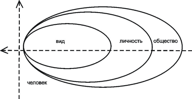 В этой триаде одна единица представляет вид, другая – личность, третья – общество. Данное тройственное единство сочленяется и проходит становление на оси абсциссы пространства и ситуации и ординаты времени и зрелости.
