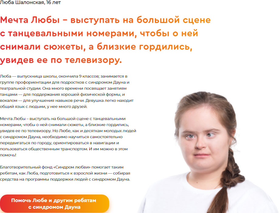 Как мы решили эту задачу в «Синдроме любви»? Стоит заметить, что организация – новая, она получила госрегистрацию в июне 2016 года. В центр любого сообщения мы стремимся ставить не фонд, а интересы людей с синдромом Дауна, иллюстрируя их конкретной историей. При этом объясняем, что это лишь один пример из сотен тех, кому нужна помощь. Например, история Любы, участницы акции «Любите любых. Помогайте без условий».