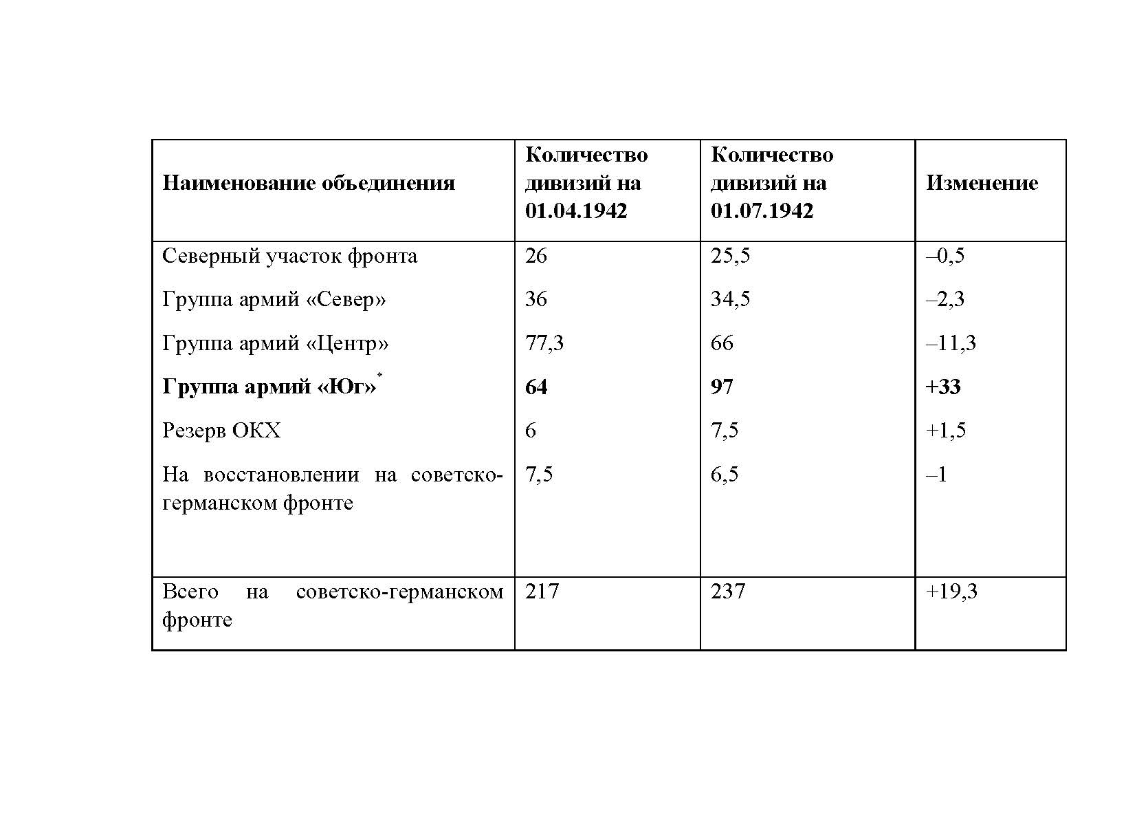 Таким образом, к 11 апреля 1942 года генеральный штаб немецких сухопутных войск разработал на основе директивы № 41 приказ о проведении операции «Блау» на южном крыле советско-германского фронта. Началась их организационная подготовка к предстоящим боевым действиям, а также усиление и перегруппировка немецких войск Восточного фронта. Основные силы немецко-фашистской армии были направлены в группу армий «Юг», о чем свидетельствует следующая таблица.