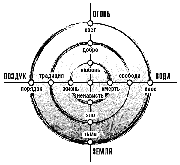 Внимательный анализ системы стихий и первооснов, погружение в изучение трёх кругов сил показывает, что соединение стихий Огонь-Земля в вертикаль взаимодействия (так же как и соединение стихий Воздух-Вода в горизонталь) не является изначально природным – это несколько искусственный процесс. В натуральном движении стихий Огонь может пройти к Земле только через Воздух. Для того чтобы обеспечить иное взаимодействие, нужна другая система, для которой это взаимодействие будет нормальным. Такая система была сделана и впоследствии получила общее название «эгрегоры». Принцип существования тот же – конфликт, но форма уже иная: здесь конфликт должен быть законченным, с видимым и фиксированным результатом.