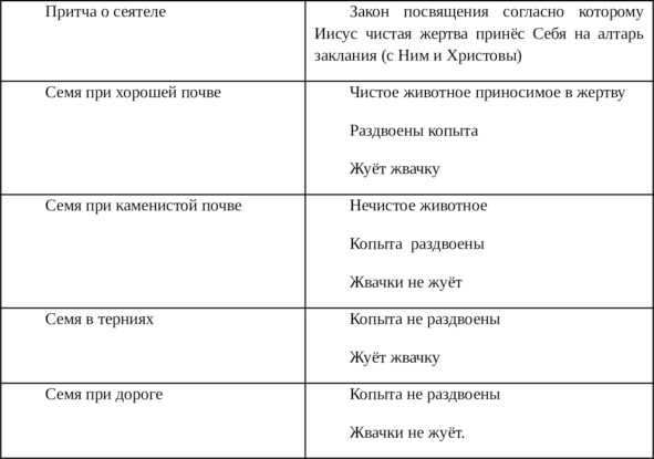 Если увидеть положительную сторону посвящения по иудейскому цермониальному закону, условно не обращая внимание на кровные жертвоприношения, то можно видеть определенную систему посвящения. (Рим. 12;1, Левит 1 гл., Левит 11;2—4,26, Евр 8;1—2). Поэтому хочется привести некоторую аналогию, сравнения прообразного церемониального служения посвящения, притчи Христа «О сеятеле»» и мудрости Востока, которую используют учителя «внутреннего христианства».