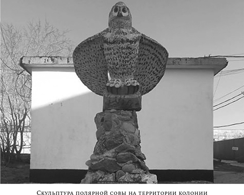 «Случается с нами порою беда,И мы утопаем в слезах и печали,Но нам невдомек, что свершилась судьба,Которую нам небеса начертали».ВИТАС ЖИГЛИСДвери контрольно-пропускных пунктов с грохотом закроются за моей спиной многократно, потому что в этой тюрьме несколько КПП. Колючая проволока, бетонный забор под высоковольтным напряжением, вышки с автоматчиками. Территория для ПЛС – это, по сути, тюрьма в тюрьме. Вся «Полярная сова», кстати, полностью автономна, и если в поселке отключат отопление, свет и воду, то колония сможет обеспечивать себя сама многие дни и даже месяцы, пока не придет помощь с Большой земли. На фоне колючей проволоки особенно трогательно смотрятся скульптуры и рисунки белой совы, которые здесь можно встретить в самых неожиданных местах.
