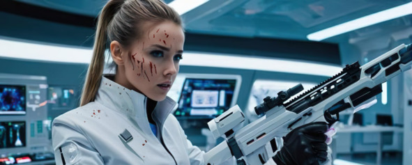Грянул адский грохот выстрелов. В медотсеке начался хаос и ад из стекла и осколков. Оружие инопланетян строчило очередями не давая поднять капитану и медику головы. Гросс отчаянно отстреливался, прикрывая Холли с ребёнком. Он ранил одну захватчицу, но второй выстрелил капитану в плечо. Гросс зарычал от боли, содрогнувшись, но он не сдавался. В голове Холли взорвалась паника. Она с ребёнком на руках пряталась за опрокинутую койку. Грохотал адский гимн смерти:
