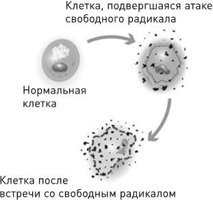 Свободные радикалы вступают в реакцию с другими молекулами, в результате происходит окисление, целью которого является нейтрализация нестабильного электрического заряда. Окисление – это, по сути, «биологическая коррозия». Оно создает эффект снежного кома, т. е. молекулы крадут друг у друга электроны, становясь в ходе кровавой биологической борьбы новыми свободными радикалами. Быстро растущее количество свободных радикалов приводит к разрушению как самой клетки, так и митохондриальных мембран. Такой процесс называется перекисным окислением липидов. Он вызывает хрупкость мембран и их распад.