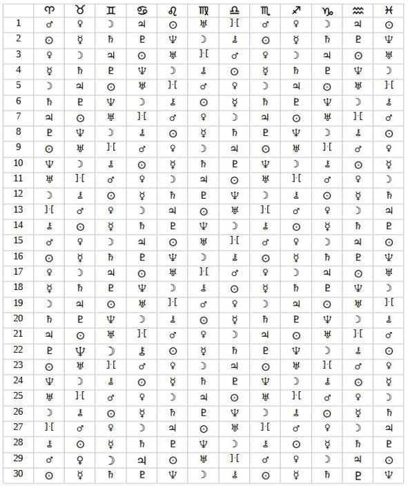 Сначала разберемся как был составлен данный календарь. Порядок следования планет всегда одинаков. Первые семь градусов соответствуют планетам, начиная с Овна, которым управляет Марс, на ним следует Солнце, затем Венера, Меркурий, Луна, Сатурн и Юпитер. Через семь градусов, начиная с восьмого, планеты септенера, кроме Луны и Солнца, заменяются на их соответствующие планеты высшей октавы: