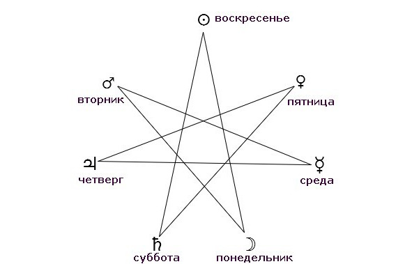 Данный порядок следования планет взят из звезды магов. В этой звезде есть последовательность по дням недели, а также по годам, идущая по часовой стрелке, а это и есть порядок градусов в тэбоическом календаре. На самом же деле истинный порядок дней недели и годов должен быть одинаковый. Сначала разберемся со звездой «магов».