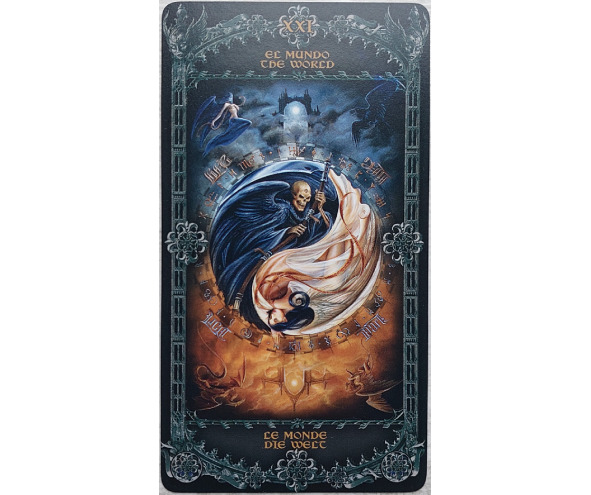 Кстати, в этой карте сделан весьма интересный подход к интерпретации символа Инь-Ян. Пассивная, «женская» сторона Инь представлена Смертью, мужским персонажем, который с превеликим энтузиазмом готов взмахнуть своей косой (весьма активный жест, надо сказать). Активная же сторона Ян, которая считается «мужской», показана в виде Ангелицы в белых одеждах, молитвенно сложившей руки.