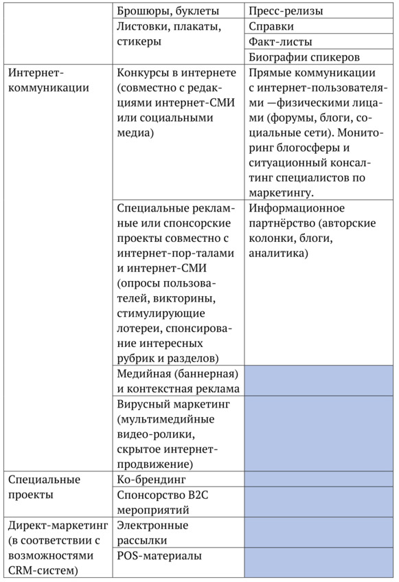 В таблице ниже представлен пример матрицы распределения инструментов и каналов коммуникаций в маркетинге и PR на примере направления работы с частными клиентами: