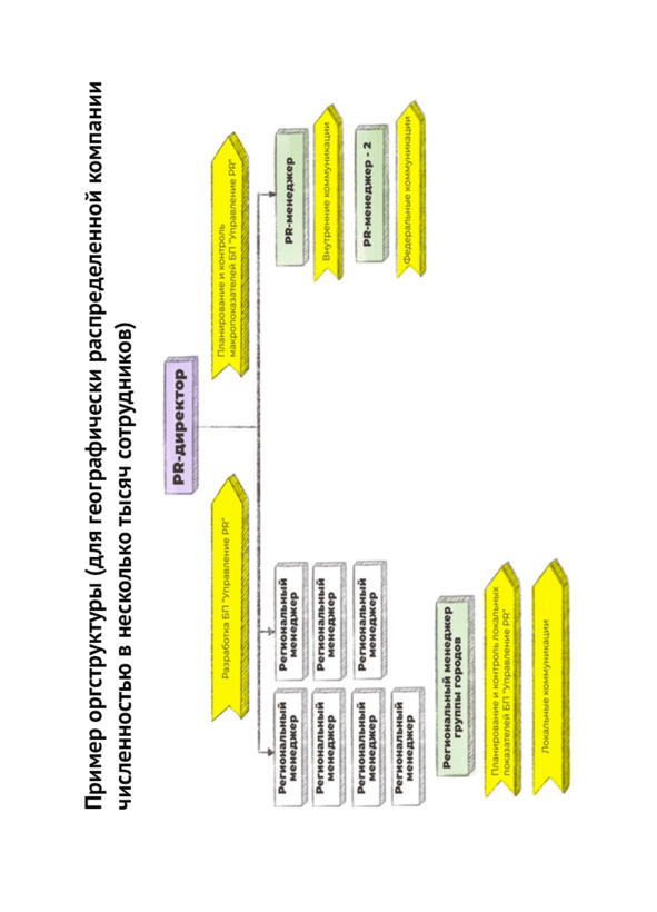 Например, вы можете на первых порах объединить несколько функций (взаимодействие со СМИ и организацию мероприятий для ЦА), группу близлежащих городов отдать под ответственность одного PR-менеджера и тому подобное. Для географически распределенных компаний характерно деление на централизованные и локализованные функции. Когда в головном офисе есть PR-служба, управляющая федеральными и централизованными коммуникациями (в соцмедиа, например), а также разрабатывающая план действий и координирующая локальных сотрудников в отдельно взятых городах. Либо это могут быть сотрудники в головном офисе, управляющие коммуникациями в нескольких городах удаленно. В эпоху онлайн это весьма распространенное явление.