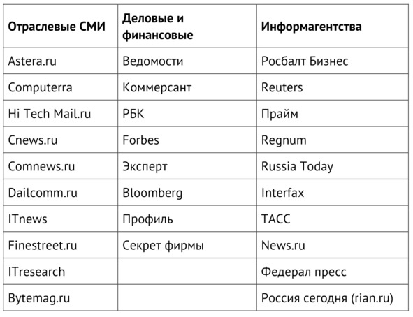 В качестве примера приведем фрагмент типологии и перечня СМИ федерального уровня для компании, работающей в сфере высоких технологий: