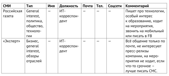 Помимо базовых данных о СМИ и журналистах (название, контактное лицо, адресные данные и т.д.) очень полезно указывать специализации СМИ и личные интересы журналиста, ссылки на их соцсети, личные пометки после общения.
