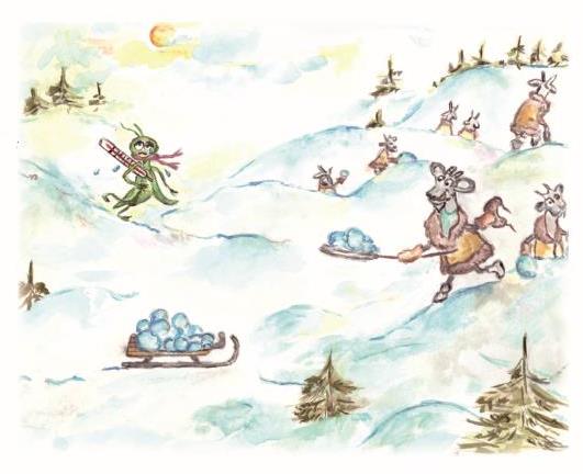 Кузнечик рос среди козлят,Учился прыгать и скакать,Любил на шалости подбить ребятИ с горы как птица полетать.Но тут пришла зима,Снег выпал, всё покрыл,На реках стало много льда,И кузнечик наш простыл.Козлята бегают везде —Под шубкой хорошо, в тепле.Герою плохо, а снег идёт,И помощь что-то не идёт.На солнце снег блестит,И не видать героя,Никто уж больше не шалит,Никто не знает горя.