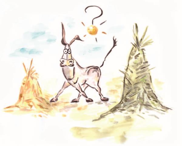 Ослу, мы знаем, меж двух стогов выбор сложен.Эксперимент не видел, но слыхал.А посему давайте тему мы разложим,Чтоб в домыслах никто не упрекал.Выбор есть, и как же поступить?Почему ослу не сделать шаг?Он может получить и гордым быть,Но и боится он попасть впросак.Когда есть выбор в жизни, а это так,Конечно же, не хочется попасть впросак.Ты размышляешь, полагаешь, что да как,И не считаешь, что ты сам дурак.Ты чувствуешь, что надо вправо.Потом вдруг это кажется корявым.Слушаешь, как говорят из уст,Но истина на стыке разума и чувств.