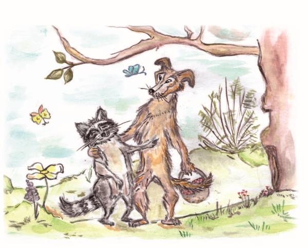 Утро наступает, солнце встаёт.Лучи его в росе сверкают.Пение птиц ласкает слух,Порханье бабочек на басню вдохновляет.Жил енот с семьёй в норе,Заботился, растил, кормил.Другой герой родился в конуре,Его хозяин часто бил.Собаку ту на охоту потащили.Говорят: «Найди, порви, подай».И понеслась она, боясь, чтоб не убили:«А ну все прочь! Скорее убегай!»В тот день енот пошел гулять,Не то травы нарвать иль позагорать.Вдруг выскочила псина прямо на зверька.Енот подумал: «Вот, пришла беда!»А он помчался сквозь кусты.Собака ринулась за ним.Кричал енот: «Мне всё, кранты!Боюсь я злобных псин!»Но вдруг собачий хвост застрял,Уж больно много веток было.Пёс рвался, бился: «Нет, попал!» —От енота горе отступило.Без сил собака залегла.Быть может, так бы умерла.Хозяин никого искать не стал,Домой он быстро зашагал.Енот остановился, но страх толкал,Давно другой бы убежал.Не мог оставить он беднягу,Теперь уже ненужную дворнягу.Помог он выбраться собаке.И что же та?Пропали злость и гнев,Но в чем её судьба?Прошли недели.Птицы по утрам всё пели.Сверкало солнце сквозь траву.И что же дальше? Ну?Теперь енот и пёс – друзья.Живут дружно, большая семья.Читатель, страх свой убери.Будь примером дружбы и любви.