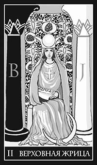 На рисунке закутанная в покрывало молодая женщина сидит на троне. Ее правая рука покоится на коленях, придерживая и прикрывая полой одежды свиток пергамента: то, что на нем написано, прочитать нельзя. За спиной Жрицы две колонны. Они называются колоннами Яхин (солнечная) и Бохаз (лунная). Такие колонны стояли при входе в храм Соломона. Колонны образуют как бы створки ворот, просвет, вход в святая святых, занавешенный в глубине тканью. Голову женщины венчает корона в виде лингама, объединяющего диск Солнца и рога Луны. Планета-управительница этой карты – Луна. Корона также показывает три фазы Луны: молодая, полная и убывающая. И это соответствует трем возрастам: девушки, женщины и старухи. Циклы женской жизни повторяют циклы жизни Луны. В этой карте акцентирована тема девственной Артемиды.