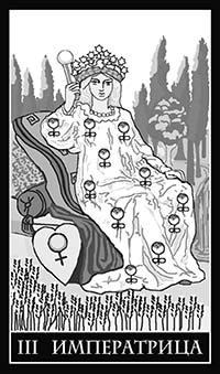 На традиционном рисунке изображена беременная женщина в свободных одеждах, восседающая на троне. В ее диадеме 12 звезд. На щите, прислоненном к креслу сбоку – символ Венеры. Платье также украшено символами этой планеты. Она восседает на троне в виде кушетки, очень комфортном. Перед ней колосится нива, за ней водопад – она окружена символами изобилия. Скипетр в ее руке увенчан шаром, символом этого мира. Благодатная матерь многих тысяч, она символизирует земной рай. Главный смысл этой карты – порождение и выкармливание, продуктивный процесс. Это дверь или врата в земную жизнь. Но это и тот путь, что выводит отсюда в потустороннее.
