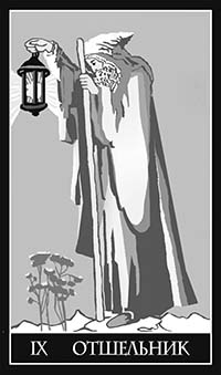 Одна из карт Посвященных. Ее связывают с основным воплощением Тота, египетского бога мудрости. Он считается лунным Богом, Аркан Отшельник сопряжен с Арканом Луна. Каждый человек несет в себе частицу Бога, познание самого себя есть попытка исследовать глубины духа. Познание может быть рациональным, основанным на логическом осмыслении, и может быть иррациональным, где в основе – ментальные и интуитивные озарения и откровения. В карте явен этот аспект двойственности познания – рационального и иррационального. Перед нами вновь вертикально стоящий человек, он опирается на посох, то, что его ступни сопряжены с землей, символизирует наличие эмпирических знаний, знаний, связанных с опытом, с рациональным знанием. Фонарь в руке старца говорит о ментальных интуитивных озарениях и откровениях. Этот путь постижения сокровенных знаний связывается с обрядом Посвящения. Карта связана с обретением пути, цели и смысла жизни.
