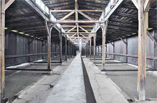 Holzbaracke vom Typ »Pferdestall« in Auschwitz-Birkenau. Diese war ursprünglich für 52 Pferde konzipiert worden. Bis zu 1.000 Kinder, Frauen und Männer, manchmal auch mehr, mussten darin hausen.