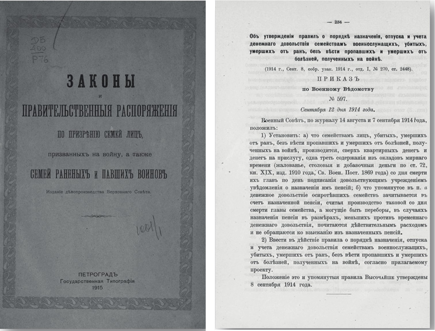 Рис. 1. Фрагмент книги «Законы и правительственные распоряжения по призрению семей лиц, призванных на войну, а также семей раненых и павших воинов»62